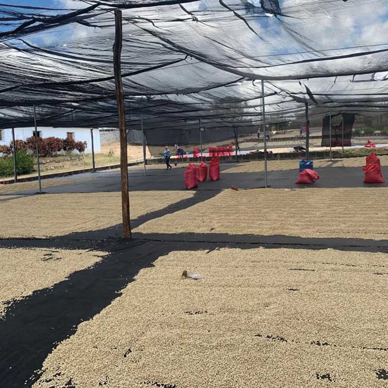 After the coffee is harvested, it is measured, the beans are selected, floated, pulped, and then left to ferment for 18 to 24 hours. After this, they are washed with clean water. The coffee is then transported in plastic bags and new jute sacks, taking special care to ensure cleanliness during transportation. The coffee received at the dry mill is sent to African drying beds, which are covered with a roof inside a microtunnel to prevent any contact with the ground. Plastic rakes are used to move the coffee. Once dry, the coffee is stored in a specific area within the warehouse, always separate from the other coffees handled by the mill. When ready for export, the coffee is lifted from the patios to achieve a humidity level between 11 and 11.5%. It is then stored in warehouses for about a month, before it is hulled, sorted according to the customer's requirements, and packed in new jute sacks and Ecotact bags, with the corresponding ICO.