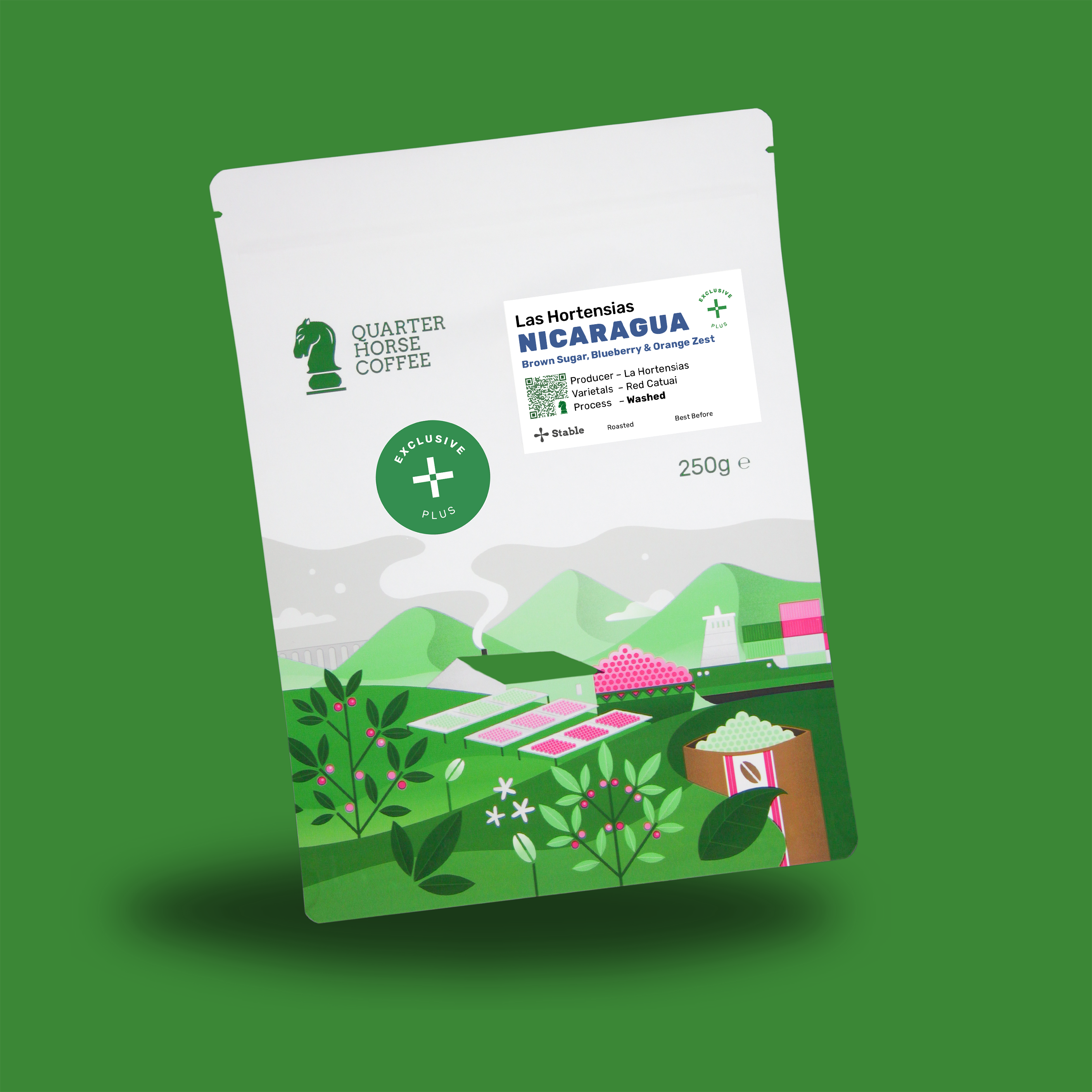 The Hortensias lot is cultivated at altitudes between 1200 and 1300 meters on a 1.5 hectare plot. The farm uses eco-friendly practices, providing shade with forest species, fruit trees, and bananas. Regular pruning and shade management improve plant health, and only ripe cherries are manually harvested.